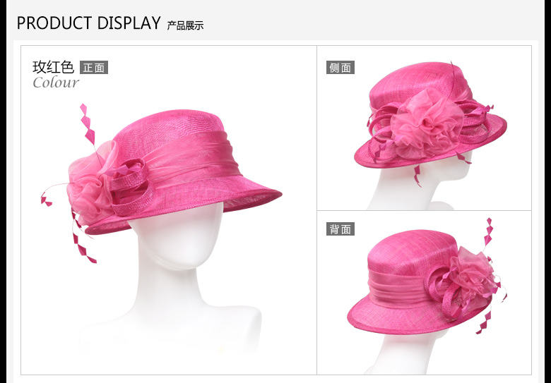 帽子的帽花部分別出心裁的采用輕軟的薄紗褶皺式設(shè)計(jì),大膽而不張揚(yáng)。給帽子增添了些許靈動(dòng)感和嬌媚,優(yōu)雅風(fēng)范彰顯無疑。