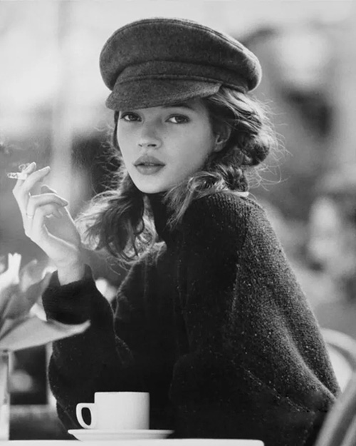 Kate Moss的高領(lǐng)毛衣配上她等待的表情,性感又溫柔,黑色報(bào)童帽讓她看起來柔中帶酷,詮釋穿搭剛?cè)岵?jì)的經(jīng)典照之一。