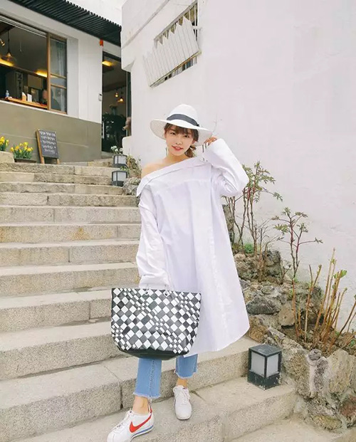 即使沒有時(shí)間去沙灘海邊,在都市里你穿上一字肩上衣搭配高跟鞋,戴上草帽一樣能擁有度假的好心情。